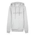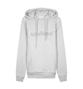 Organic cotton-blend grey sweatshirt by Soulland, featuring a relaxed fit, adjustable hood, front pocket, and prominent logo.
