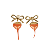 The Ottolinger Bow Heart Earring is a statement accessory that artfully blends bold design with elegant craftsmanship. Featuring a striking bow silhouette and heart-shaped drop, these earrings are crafted from 90% alloy metal and 10% polyurethane. Each piece is hand-dipped in rubber paint, resulting in a unique gradient effect. The gold-tone metal base is complemented by an orange rubberized coating, offering a modern twist to any outfit. Secured with a post-stud fastening, they are perfect for adding a touch of avant-garde flair.