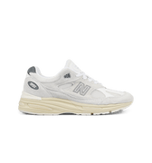 The New Balance 991OW2 offers a stylish blend of premium materials and design elements, making it a standout in any sneaker collection. Featuring a combination of light grey pigskin suede and stark white mesh, this sneaker is accented by leather overlays and silver-grey TPU eyelets. The FuelCell cushioning encapsulated in vintage cream-colored PU foam with ENCAP technology ensures comfort. Embroidered "v2" branding and a leather tongue add an elegant touch, perfect for elevating your everyday look.