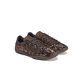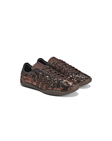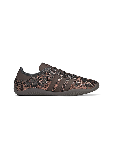 The Wales Bonner Karintha Sequin by adidas is a striking collaboration that merges fashion-forward elements with classic sneaker aesthetics. Featuring reversible sequins that shimmer in black, brown, silver, and gold, this shoe stands out with its sleek silhouette and slim soles. Matte brown textile accents add subtle contrast, while the embossed grid pattern on the outsole complements the Trefoil emblem. This design is perfect for elevating your style, bringing a unique and sophisticated touch to any ensemble.